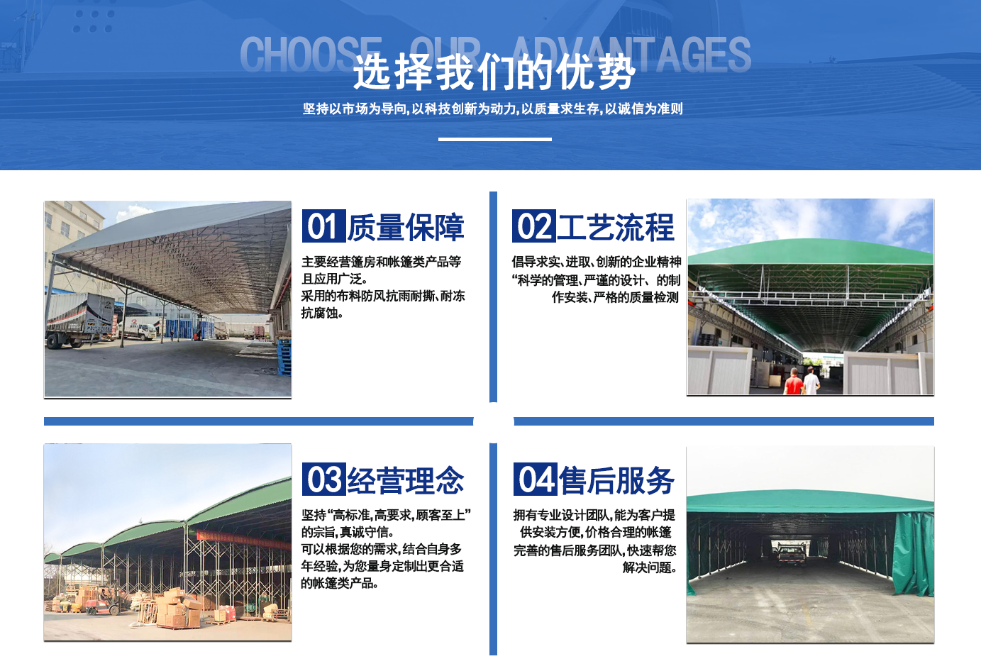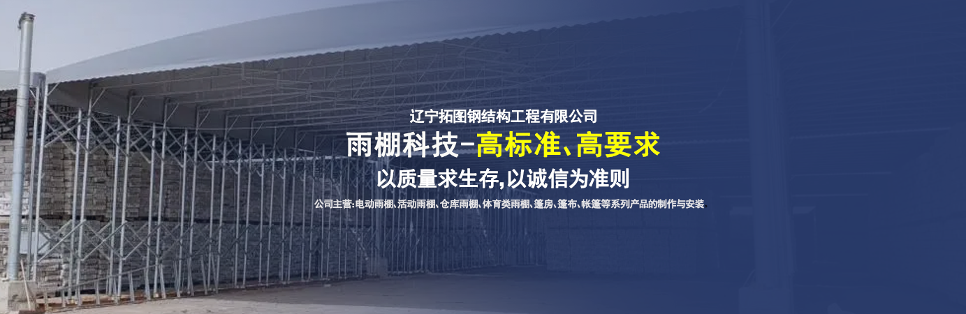 遼寧拓圖鋼結構工程有限公司是一家專業從事推拉篷設計、制作、安裝、使用、維修的綜合性公司。公司主營:電動雨棚、活動雨棚、倉庫雨棚、體育類雨棚、篷房、篷布、帳篷等系列產品的制作與安裝?! ?nbsp; 遼寧拓圖鋼結構工程有限公司堅持以市場為導向,以科技創新為動力,以質量求生存,以誠信為準則,倡導求實、進取、創新的企業精神。“科學的管理、嚴謹的設計、 的制作安裝、嚴格的質量檢測、良好的后期服務成就企業的信譽,為您提供優質服務。 遼寧拓圖鋼結構工程有限公司傾力于開發應用三維空間結構與新材料的結合,將廣告藝術視覺表現形式與張力膜材科學的結合,推出多彩推拉蓬,依靠先進的科學技術,將推拉蓬建筑表現形式無限延伸,立志走在建筑科學的前沿,引導建筑時尚潮流,我們的目標是使推拉蓬建筑在中國發展壯大?! ?nbsp; 遼寧拓圖鋼結構工程有限公司憑著極強的事業熱情和豐富的專業經驗以“勤勉進取、銳意創新、至誠至信”的精神使公司得到迅速健康發展,業務范圍遍及全國。科學的管理、嚴謹的設計、高標準的制作安裝流程,嚴格把控產品質量,熱誠的售后服務是企業競爭力的源泉。 遼寧拓圖鋼結構工程有限公司人愿以最誠摯的態度,歡迎廣大客戶的蒞臨與溝通!愿為市場提供優...